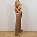 Souprava kombinovaná s nadčasovou eleganci s luxusním pohodlím. Plynulá blůza a široké kalhoty z lesklého materiálu zajišťují stylový vzhled – ať už v každodenním životě nebo při zvláštních příležitostech.